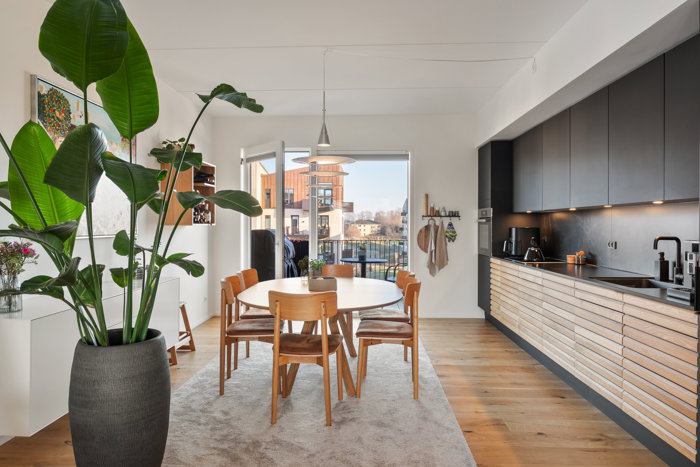 I fornemmer straks flowet i lejligheden, hvor entréen smelter sammen med først den rummelige stue med det smukke lysindfald og slutteligt det moderne køkken med de hvide fronter. Den stilfulde minimalisme er at spore fra start til slut, og I overraskes nok ikke, når I hører, at hele herligheden er indflytningsklar.