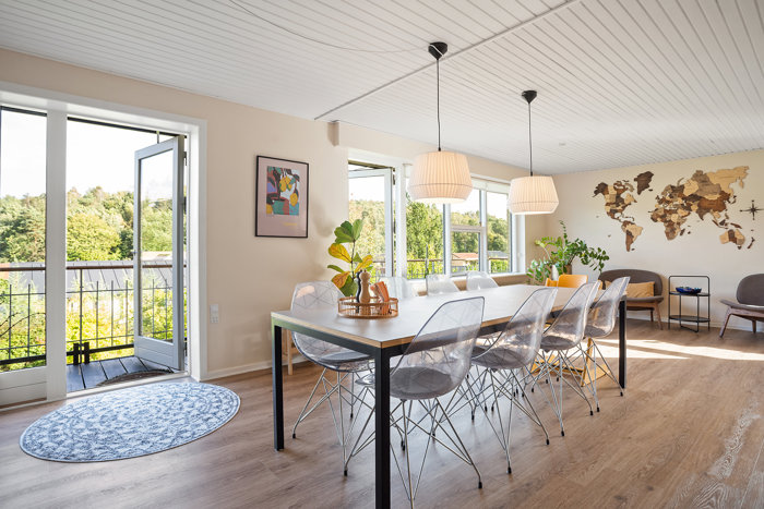 Her får I en 70’er-villa med masser af plads, løbende vedligehold og nyere tag og vinduer. De moderniserede leverum stråler med loft til kip og akustiklofter, der giver en varm atmosfære og plads til både tv-stue, loungemøbler eller legehjørne. Fra stuerne er der direkte udgang til altanen, hvor udsigten flytter helt ind i hverdagen.