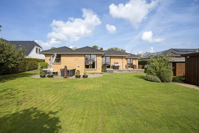 Bag villaen breder haven sig med en stor, plan græsplæne omkranset af tæt hæk mod naboerne og åbent mod markerne, hvor børnene trygt kan lege dagen lang. Den imponerende træterrasse skaber rammerne for lange sommeraftener med venner og familie, mens forhaven byder på endnu en terrasse til de stille øjeblikke i solen. Herude er der altid plads til et glas vin, børnelege eller havefester.