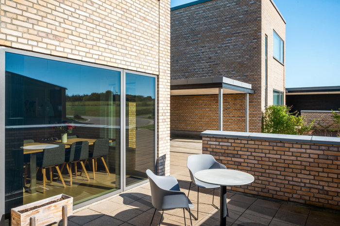 Boligen rummer 120 m² fordelt på to plan, hvor hver eneste kvadratmeter er udnyttet optimalt. I stueplan samles hverdagen i et lyst opholdsrum, hvor køkken og stue ligger i åben forbindelse. De store vinduespartier fra gulv til loft lukker lyset ind og skaber en flot overgang mellem inde- og udelivet. Her er god plads til både spisebord og sofamiljø, og fra stuen er der udgang til en solrig terrasse og en overskuelig have.