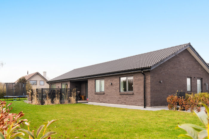 Den store udestue med buede vinduer fungerer som et ekstra opholdsrum med fuldt kig til haven. Herfra er der få skridt til de flisebelagte terrasser og den lukkede, grønne grund, som omkranser huset.