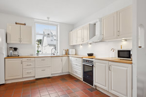 Stort køkkenalrum med god plads og naturligt lysindfald fra vinduer. Her er der åben forbindelse til spiseafdelingen, som giver en dejlig atmosfære og mange anvendelsesmuligheder.