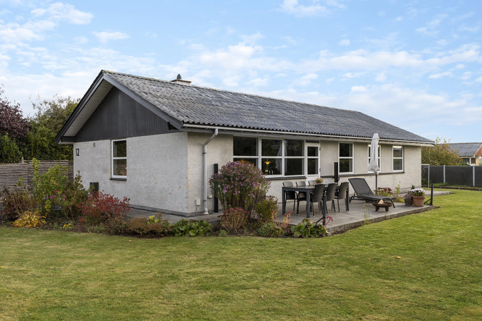 Ude venter en smuk ramme om livet i villaen med pudsede hvide vægge og rødt træværk. Den rummelige grund ligger ugeneret for enden af en blind vej, med sydvestvendt terrasse, plæne og frugttræer – æbler, pærer, moreller og vindruer – perfekt til leg, hygge og sommerdage.