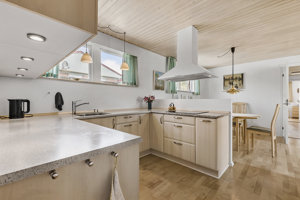 Boligen byder velkommen gennem et rummeligt bryggers med god plads til både vaskeafdeling og opbevaring. Herfra træder du ind i et funktionelt køkken/alrum, der ligger i åben forbindelse med den store stue. Stuen er boligens naturlige samlingspunkt med plads til både spisebord og sofaafdeling, og herfra er der direkte adgang til den flotte udestue, som forlænger sæsonen og skaber en skøn overgang mellem inde- og udeliv.