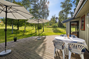 Udendørs kan I nyde flere dejlige terrasser samt en skøn have med god plads til hyggelige aktiviteter og ophold i det fri. Desuden er der kun 10-12 minutters gåtur til stranden, hvor man kan skabe uforglemmelig minder med familie og venner.