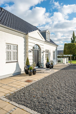 Den smukke, hvidpudsede facade prydes af store vinduespartier og et flot tegltag. Huset fremstår præsentabelt fra alle vinkler og byder på et harmonisk og indbydende førstehåndsindtryk.