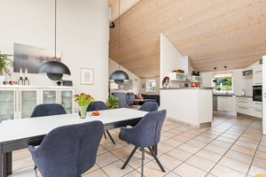 Køkken/alrummet byder på højt til loftet, store vinduer og en åben overgang til stue og spiseområde. Rummets luftighed og naturlige lysindfald skaber en indbydende atmosfære med direkte udgang til terrassen.