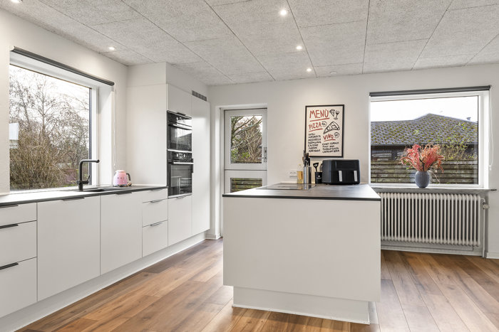 Køkkenet har vinduer mod haven, godt lysindfald samt direkte adgang til både stue og bryggers. Åben, funktionel indretning med plads til madlavning og samvær omkring spisebordet.