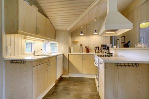 Det lyse køkken har god bordplads, vinduer og direkte adgang til opholdsrum, så måltider let deles med resten af huset.