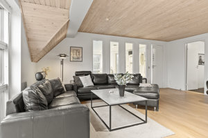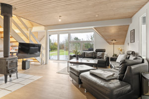 De store opholdsrum får et markant lysindfald gennem brede vinduespartier. Fra stuen er der direkte udgang til haven, og loftet i træ skaber en varm stemning.