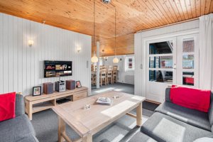 Hyggelig klassisk træfacade med nem adgang til både have og terrasse, hvor det naturlige lys og de fredelige omgivelser danner rammen om sommerhuslivet på Strandvejen.