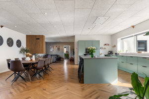 Køkkenalrummet byder på et skønt lysindfald fra de store vinduer og god plads omkring den rummelige bordplade. Her opleves en åben og indbydende atmosfære, hvor hverdagens aktiviteter kan udfolde sig naturligt.