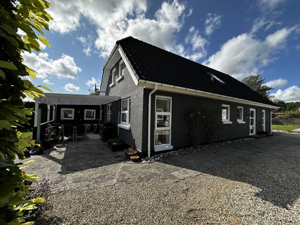 Ejendommens flotte facade og velplejede have skaber en indbydende ramme. Store græsarealer og terrassedør slipper lyset ind og forener huset harmonisk med udeområdet.