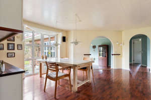 Rummelig stue med store vinduespartier, der giver et skønt lysindfald. Fine forbindelser til haven via glasdøre og en god atmosfære, hvor du let skaber boligliv med udsigt til naturen.