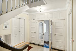 Stuen fremstår indbydende med flot lysindfald fra store vinduer og en åben forbindelse til køkkenet. Her er loftshøjden med til at skabe ekstra rummelighed og en behagelig atmosfære.