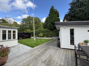 Udenfor venter en skøn have med en eksklusiv træterrasse og varieret beplantning, grønne plæne og hyggelige kroge, der inviterer til både afslapning og leg under åben himmel. Haven og terrassen fremstår velholdt og indbydende – perfekt til både stille forårsmorgener og stemningsfulde sommeraftener.