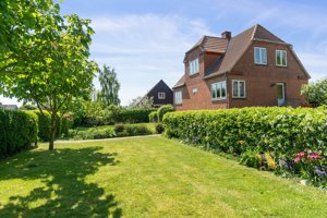 Charmerende murermestervilla med rødt tegltag og klassiske detaljer. Store vinduespartier giver et flot lysindfald, og den rummelige have byder på grønne arealer, drivhus og hyggelige kroge til udeliv hele året.