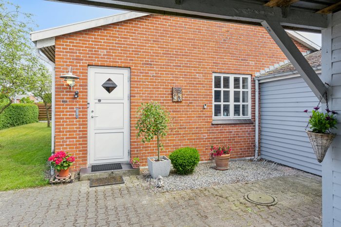 På den vestlige side af huset har I glæde af en lille, lukket have, som er indhegnet og dermed bliver jeres private helle. Den store fliseterrasse er et oplagt sted at bruge sommeraftenerne med gang i grillen og afslapning i havemøblerne. Der er en overskuelig græsplæne og et par minidrivhuse videre i haven. Masser af børnefamilier i området, og skolebussen stopper lige foran bussen.