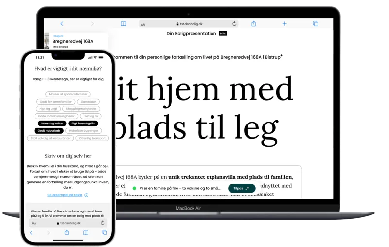 Din Boligpræsentation kombinerer AI-genereret tekst med nabolagsdata og lokale beboeres egne favoritsteder. Det giver boligkøbere en personlig præsentation, der ikke kun informerer, men også inspirerer til, hvordan en ny hverdag kan se ud.