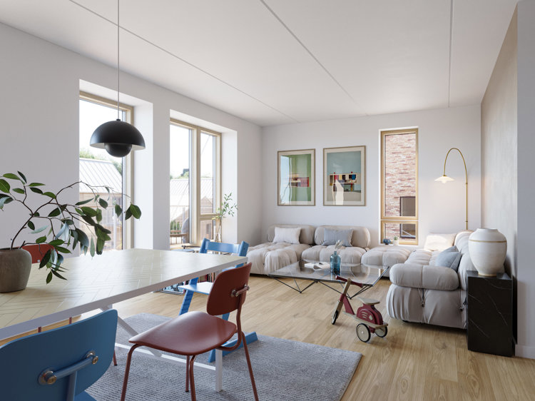 De 119 boliger varierer i størrelse fra 54–154 m² og rummer 2–5 værelser i enten ét eller to plan.